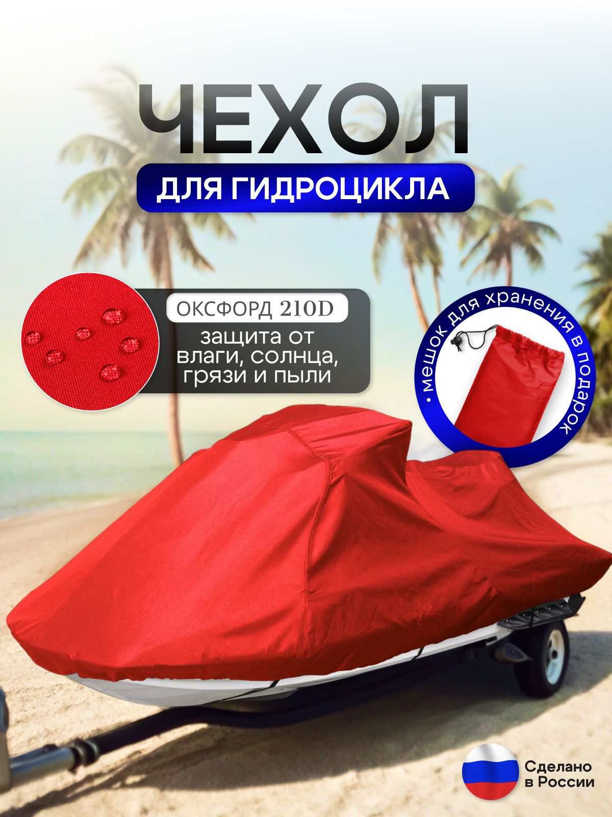Чехол на гидроцикл размер 280*125*75 см высота. Ткань - Оксфорд. Прекрасно защитит железного коня от плохих погодных условий, влаги, пыли, грязи. По центру чехла пришит ремень для надежной фиксации. Мешок для хранения в комплекте.